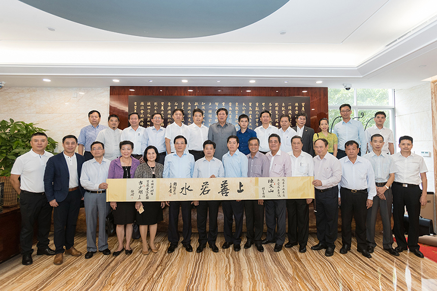 ▲寶鷹集團(tuán)向越南共產(chǎn)黨中央委員、奠邊省委書記陳文山贈(zèng)送周國城書法作品《上善若水》