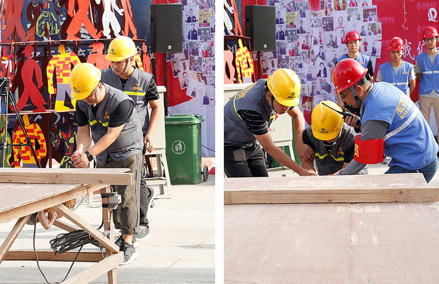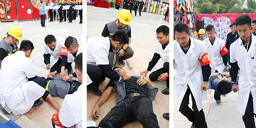 在現(xiàn)場(chǎng)搭建的模擬加工區(qū)內(nèi),一名木工因違不當(dāng)操作發(fā)生割傷,暈倒在地,旁邊的工人立即呼叫救援,醫(yī)療救護(hù)組火速出動(dòng),安全保衛(wèi)組及時(shí)隔離現(xiàn)場(chǎng),醫(yī)療救護(hù)組迅速包扎救治,各組匯報(bào)工作。全流程一氣呵成,工人得到及時(shí)救治。
