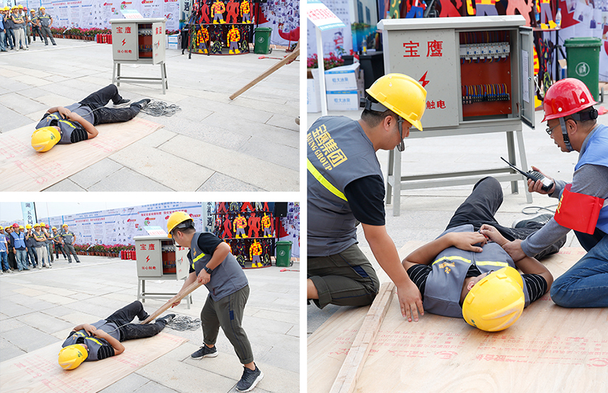 在隨后的工人觸電事故模擬現(xiàn)場(chǎng),當(dāng)觸電事故發(fā)生時(shí),發(fā)現(xiàn)事故的工人首先切斷電源,用木條拉開(kāi)電線分離觸電人員,讓其平躺并呼叫救援。