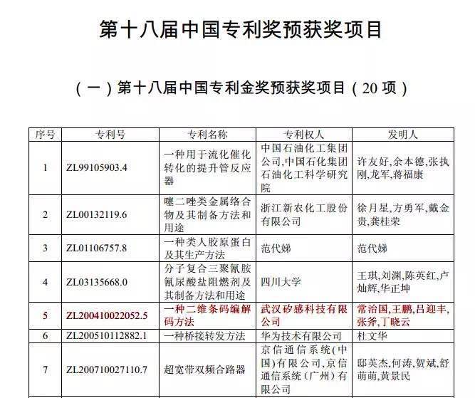 近日,從中國專利獎(jiǎng)評(píng)審辦公室獲悉,武漢矽感科技有限公司的發(fā)明專利“一種二維條碼編解碼方法”喜獲第十八屆中國專利金獎(jiǎng)。