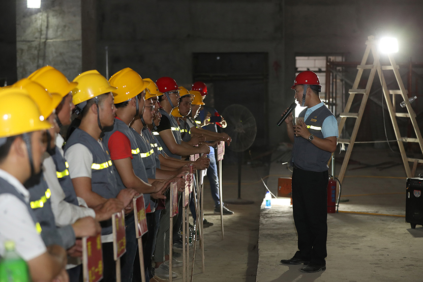 珠海橫琴星藝文創(chuàng)天地項(xiàng)目工序多、工程量大,存在著多工種、多工序的交叉作業(yè),對施工形成極大的考驗(yàn)。早在項(xiàng)目招標(biāo)時,甲方就對工程進(jìn)度和質(zhì)量提出了嚴(yán)格要求:施工單位必須嚴(yán)格遵守甲方提出的各項(xiàng)質(zhì)量標(biāo)準(zhǔn),且必須在八月初保質(zhì)保量完成。針對這一現(xiàn)實(shí)情況,寶鷹集團(tuán)立即組建保質(zhì)量、保工期工作小組,積極部署項(xiàng)目建設(shè),并召開此次安全培訓(xùn)暨百日攻堅(jiān)誓師大會,以保障項(xiàng)目如期高質(zhì)量完工。