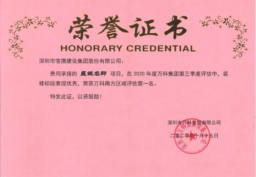 深圳萬科星城名邸項(xiàng)目在2020年度萬科集團(tuán)第三季度評估中,取得了南方區(qū)域第一名的優(yōu)異成績。