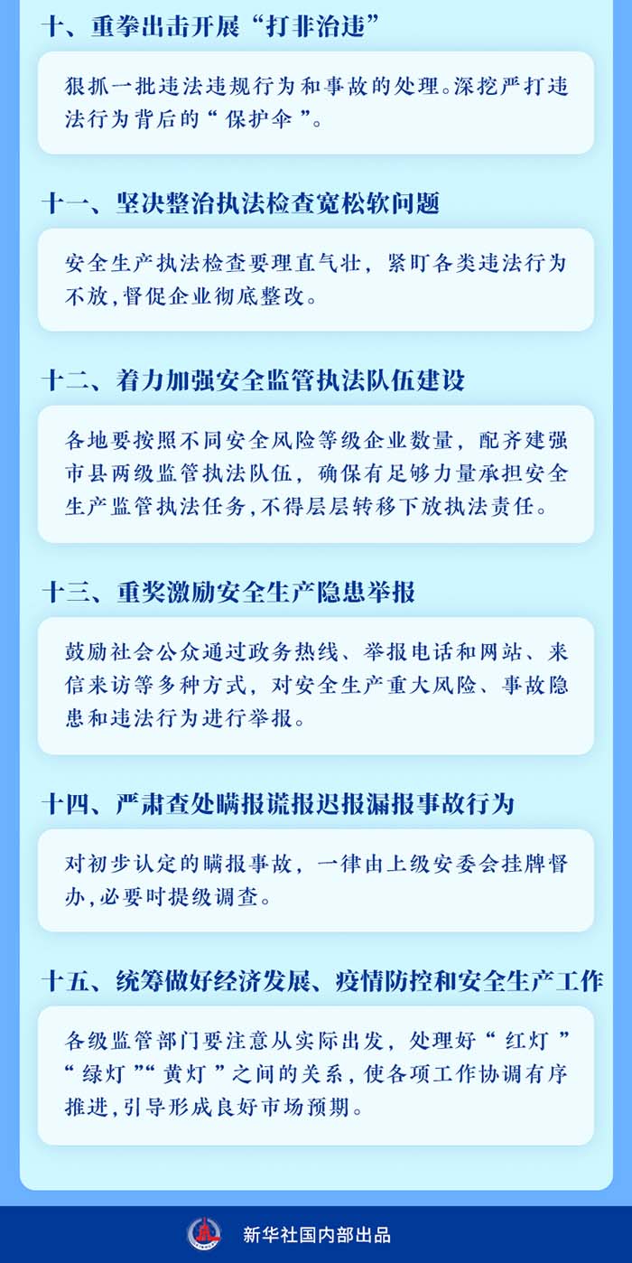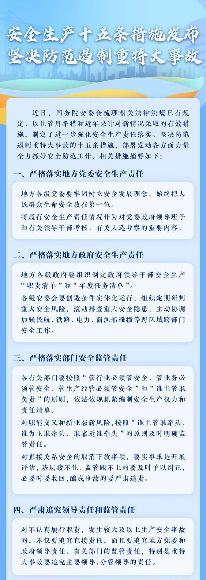 國務院安委辦有關負責人介紹,國務院安委會梳理相關法律法規(guī)已有規(guī)定、以往管用舉措和近年來針對新情況采取的有效措施,制定了進一步強化安全生產責任落實、堅決防范遏制重特大事故的十五條措施,部署發(fā)動各方面力量全力抓好安全防范工作。