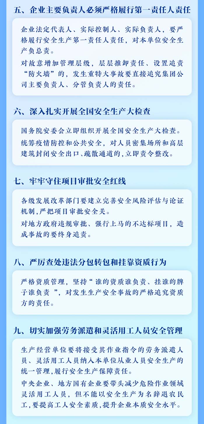 安全生產十五條措施重申了黨委對安全生產工作的領導,進一步強化黨委政府的領導責任、部門的監(jiān)管責任、企業(yè)的主體責任及追責問責。明確各有關部門要按照“管行業(yè)必須管安全、管業(yè)務必須管安全、管生產經營必須管安全”和“誰主管誰負責”的原則,依法依規(guī)抓緊編制安全生產權力和責任清單。對職能交叉和新業(yè)態(tài)新風險,按照“誰主管誰牽頭、誰為主誰牽頭、誰靠近誰牽頭”的原則及時明確監(jiān)管責任。企業(yè)法定代表人、實際控制人、實際負責人,要嚴格履行安全生產第一責任人責任,對本單位安全生產負總責。
