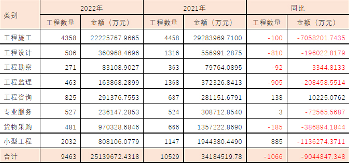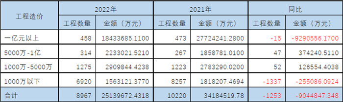 2022年重大項(xiàng)目逐步啟動,超1億元中標(biāo)金額的工程項(xiàng)目對比2021年度小幅降低,但總投資金額下降明顯,這對以承接大工程為主的施工企業(yè)來說,整個市場大項(xiàng)目投資金額降低,經(jīng)營空間進(jìn)一步壓縮。這對工程設(shè)計(jì)、勘察等方面也會造成影響。