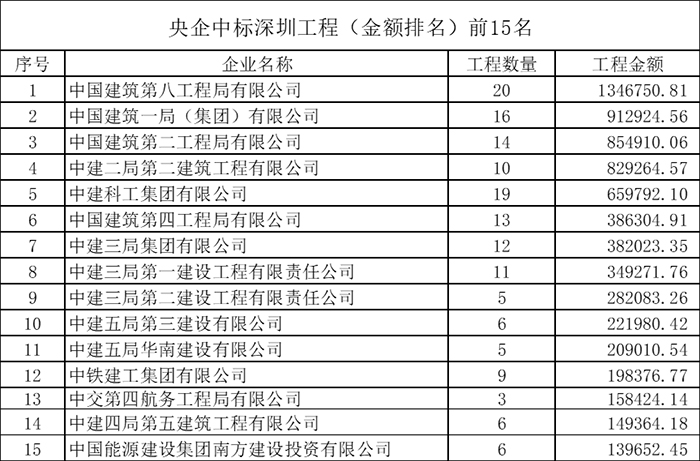 1、中央所屬建筑施工企業(yè)2021年在深圳市建筑業(yè)市場中標(biāo)排名前15名,按中標(biāo)數(shù)量排名如下: