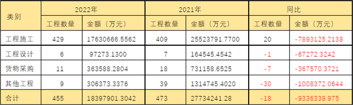 2022年工程施工招標(biāo)項(xiàng)目金額同比下降24.1%,建筑業(yè)市場投資降幅明顯。