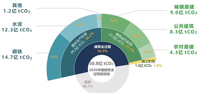 但是,中國建筑碳排放的總量龐大,建筑碳排放涉及建材生產(chǎn)、施工和建筑運行三個重要階段。根據(jù)《2022年中國建筑能耗與碳排放研究報告》,2020年建筑全過程碳排放總量為50.8億噸二氧化碳,占全國碳排放的比重為50.9%,建筑行業(yè)實施碳達峰碳中和迫在眉睫。