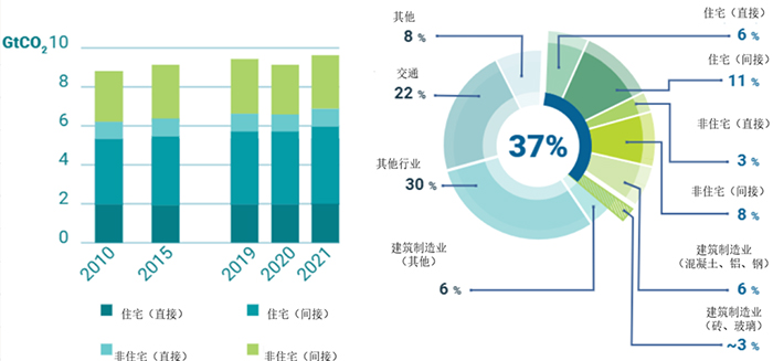 根據(jù)《2022年全球建筑和建造業(yè)狀況報告》,2021年建筑物運營所產(chǎn)生的二氧化碳排放量達到了歷史最高水平,約100億噸二氧化碳,比2020年增加了大約5%,比2019年出現(xiàn)的上一個峰值高出2%。