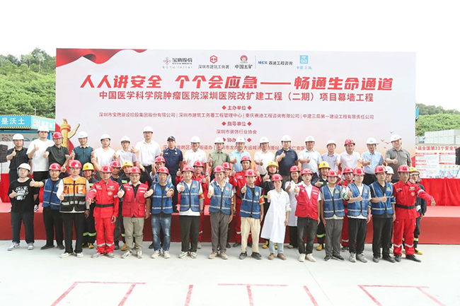深圳市建筑工務(wù)署工程管理中心副主任符翔、項目工程師殷積彪,深圳市裝飾行業(yè)協(xié)會常務(wù)副會長、總工程師王彥波、培訓(xùn)中心主任莫晉里,深圳市龍崗區(qū)龍城街道辦副主任程俊雄、副主任雷煥雄,深圳市龍崗區(qū)大運城消防救援站副站長何明,重慶賽迪工程咨詢有限公司大灣區(qū)分公司總經(jīng)理付光平,中建三局集團(深圳)有限公司一公司安全總監(jiān)劉振曉,深圳仁安醫(yī)院常務(wù)副院長吳云劍,深圳市寶鷹建設(shè)集團股份有限公司董事長肖家河、副總裁鐘志剛、安全管理部總監(jiān)陳龍、幕墻事業(yè)部總經(jīng)理韓偉杰、公司技術(shù)負責人葉石堅等相關(guān)領(lǐng)導(dǎo)以及中國醫(yī)學科學院腫瘤醫(yī)院深圳醫(yī)院改擴建工程(二期)幕墻項目建設(shè)者參加活動。