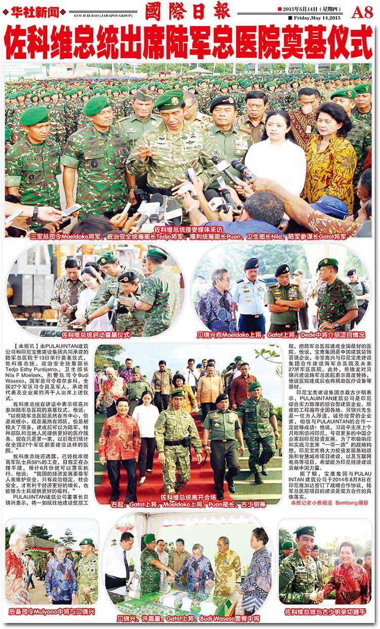 印尼最大的華文報(bào)紙《國(guó)際日?qǐng)?bào)》于5月14日刊載了印尼總統(tǒng)出席,寶鷹集團(tuán)董事局主席、印尼寶鷹總裁古少明參加的 印尼陸軍總醫(yī)院項(xiàng)目奠基儀式盛況,現(xiàn)本網(wǎng)予以轉(zhuǎn)載。