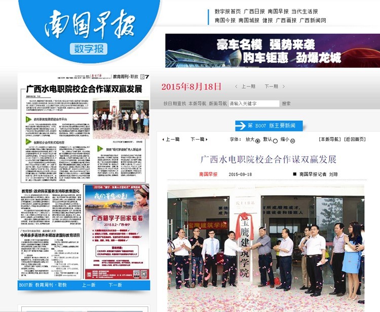 近日,廣西省級(jí)都市報(bào)《南國(guó)早報(bào)》以“廣西水電職院校企合作謀雙贏發(fā)展”為題,刊登了深圳市寶鷹建設(shè)集團(tuán)股份有限公司與廣西水電職業(yè)學(xué)院共建“寶鷹建筑學(xué)院”,“現(xiàn)代學(xué)徒制”培養(yǎng)專業(yè)人才方式的相關(guān)報(bào)道。