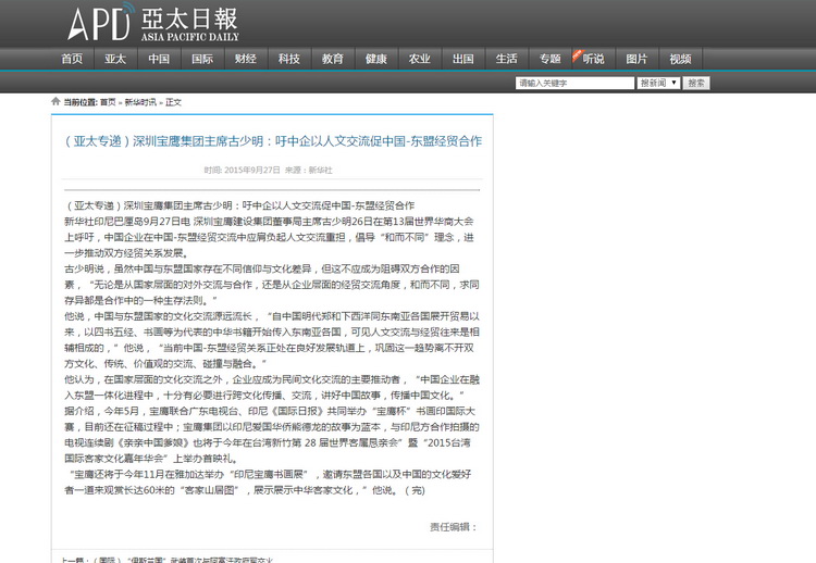 由新華社亞太總分社主辦的《亞太日報》以《深圳寶鷹集團主席古少明:吁中企以人文交流促中國-東盟經(jīng)貿(mào)合作》為題,詳細報道了古少明主席在東盟區(qū)域一體化合作論壇上發(fā)表演講的主旨,并介紹了寶鷹集團以人文促進國際文化交流的實際業(yè)績。