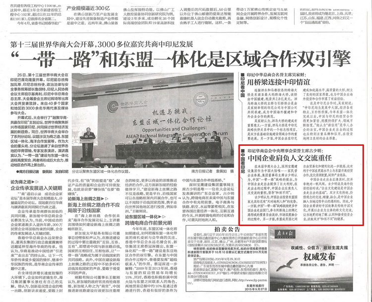 廣東省省委機關報、主流嚴肅大報《南方日報》在要聞版報道第十三屆世界華商大會時,以《中國企業(yè)要肩負人文交流為重任》為題闡述了古少明主席在東盟一體化論壇演講中提出的中國企業(yè)在走出去的過程中應肩負人文交流重任的的觀點。