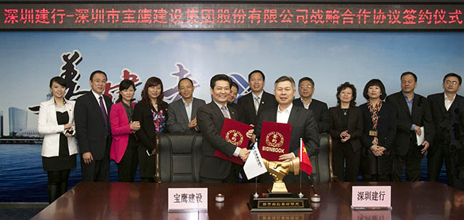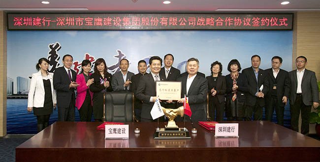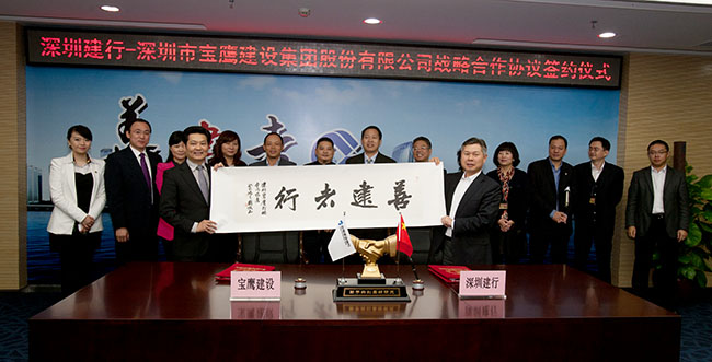 11月28日,中國(guó)建設(shè)銀行深圳市分行與深圳市寶鷹建設(shè)集團(tuán)股份有限公司簽定了授信25億元的戰(zhàn)略合作協(xié)議。當(dāng)日下午,在建設(shè)銀行深圳市分行與寶鷹股份相關(guān)出席領(lǐng)導(dǎo)的共同見證下,建設(shè)銀行深圳市分行副行長(zhǎng)戴惠明和寶鷹股份董事局主席古少明分別代表建設(shè)銀行深圳市分行和寶鷹股份簽定了戰(zhàn)略合作協(xié)議。