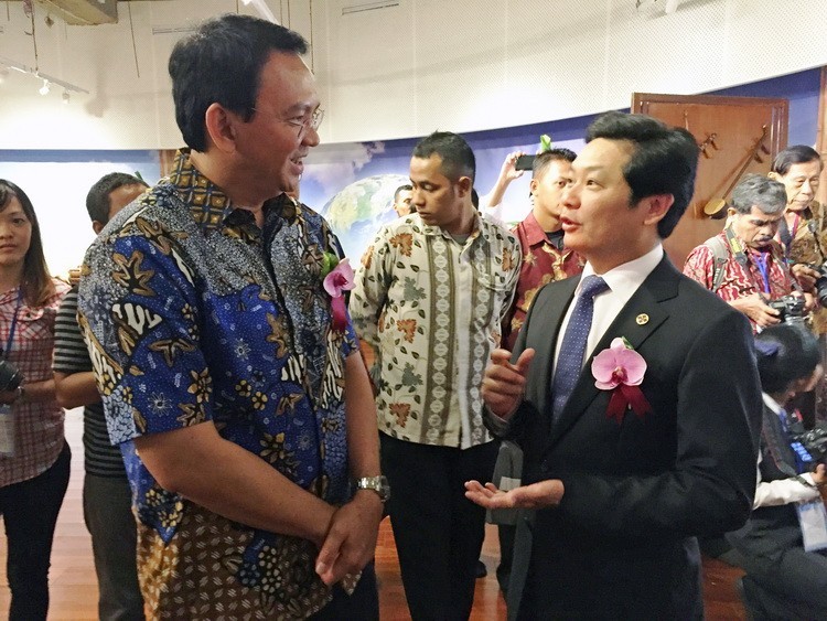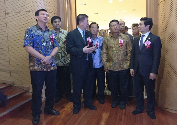 印尼慈濟基金會副執(zhí)行長、印尼安達集團董事長郭再源(右三)向印尼三軍總司令MOELDOKO上將(右二)、雅加達省長鐘萬學(左一)和寶鷹集團董事局主席古少明(右一)等介紹慈濟園區(qū)已完工的第一期項目