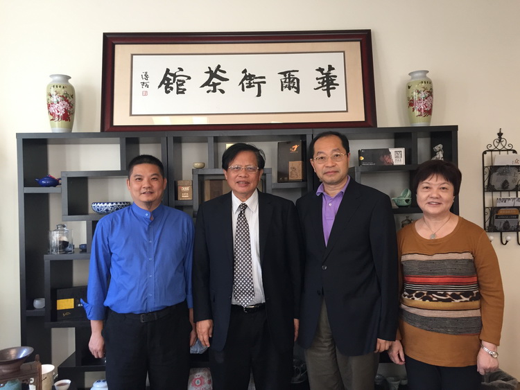 美國國會共和黨全國貿(mào)易顧問委員會名譽(yù)主席、美國哈佛管理公司·美國教育中心總裁陳麥克博士(右二)與李大西博士(左二)、胡蘭萍主席(右一)和古樸副總裁(左一)