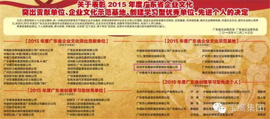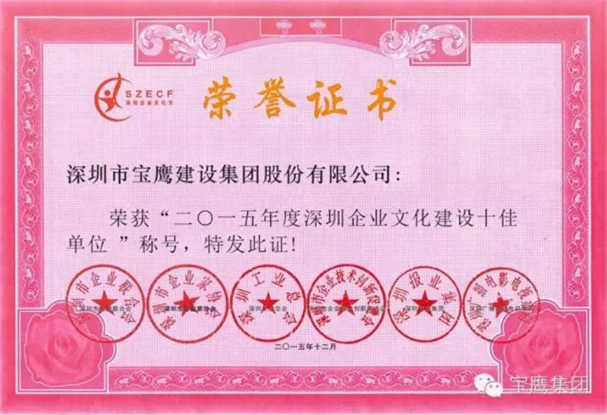 ▲寶鷹集團(tuán)獲得“二〇一五年度深圳企業(yè)文化建設(shè)十佳單位”獎(jiǎng)