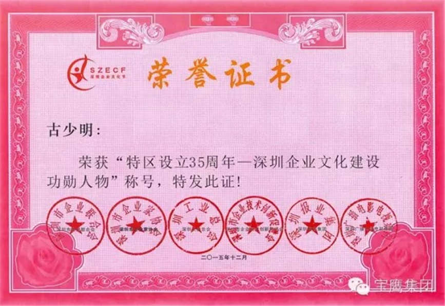 ▲董事局主席古少明獲得“特區(qū)設(shè)立35周年-深圳企業(yè)文化建設(shè)功勛人物”獎(jiǎng)