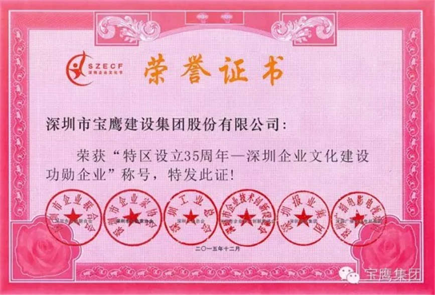 ▲寶鷹集團(tuán)獲得“特區(qū)設(shè)立35周年-深圳企業(yè)文化建設(shè)功勛企業(yè)”獎(jiǎng)