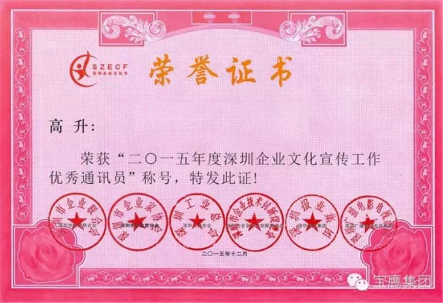 ▲文化品牌部主管高升獲得“二〇一五年度深圳企業(yè)文化宣傳工作優(yōu)秀通訊員”獎(jiǎng)