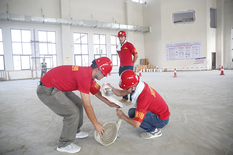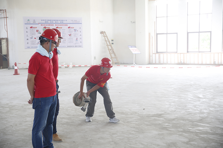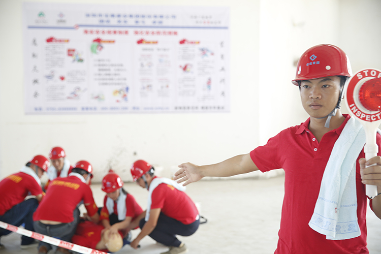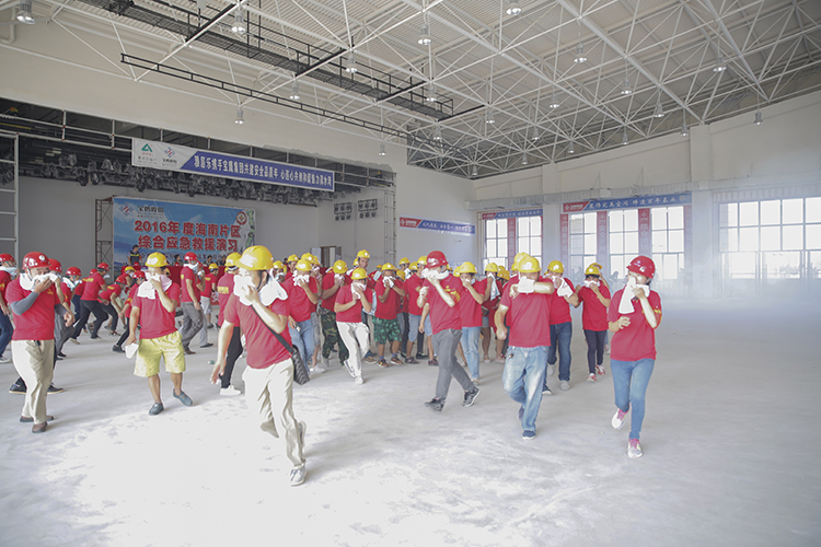 演習(xí)項目分為防臺風(fēng)演習(xí)、防雨汛演習(xí)、消防疏散演習(xí)三個大項,分別模擬了觸電、中暑、火災(zāi)、暴雨臺風(fēng)等工地常見的突發(fā)安全事件和海南當?shù)爻0l(fā)的自然氣象災(zāi)害。在觸電事件發(fā)生后,演練人員封鎖事件現(xiàn)場、撥打120急救熱線、按照正確的自救方法對傷員進行救治,迅速報告項目安全人員,同時等待專業(yè)救助人員前來救治。在火災(zāi)發(fā)生后,現(xiàn)場濃煙密布,演練人員迅速自發(fā)分為三隊從安全通道有秩序地撤離現(xiàn)場。暴雨、中暑等演練亦遵循各自的特點,在模擬實戰(zhàn)中為觀摩人員獻上豐富的一課。在滅火演練中,寶鷹集團總裁成湘文上陣為觀摩者示范了消防設(shè)備的使用方法。