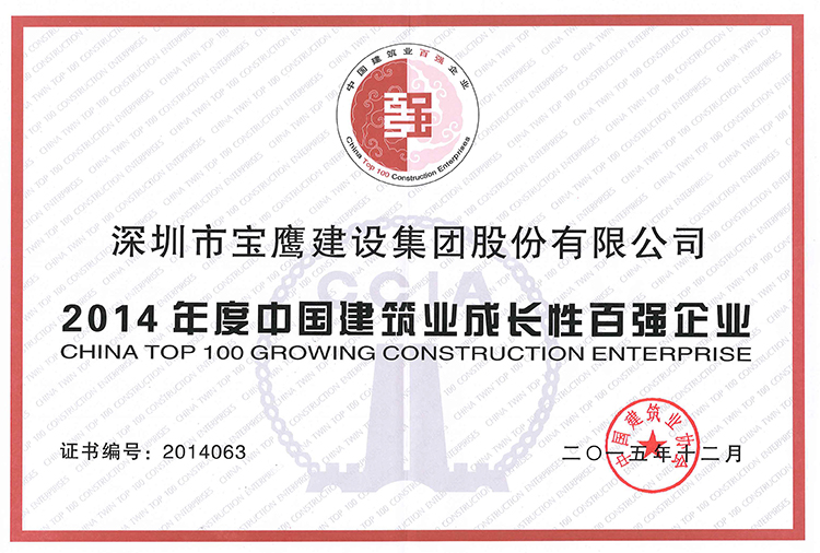 2010年——2014年,由中國建筑業(yè)協(xié)會發(fā)布的《中國建筑業(yè)雙百強企業(yè)》名單中,寶鷹集團均獲得最具成長性百強榮譽。今年首次進入競爭力榜單。在中國建筑業(yè)協(xié)會最后發(fā)布的《2015年度中國建筑業(yè)競爭力200強》名單上,80%以上的名額被大型央企、國企獲得,寶鷹集團作為榜單中為數(shù)不多的建筑裝飾類民營企業(yè),此次入圍證明上市以來集團取得的成績得到專家和社會肯定,也顯示了集團在行業(yè)的排頭軍地位和綜合實力。