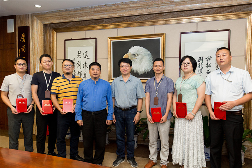 寶鷹集團(tuán)副總裁古樸(左四)、廣西水利電力職業(yè)技術(shù)學(xué)院張忠海副院長(zhǎng)(右四)與受聘為客座教授的六位寶鷹員工合影