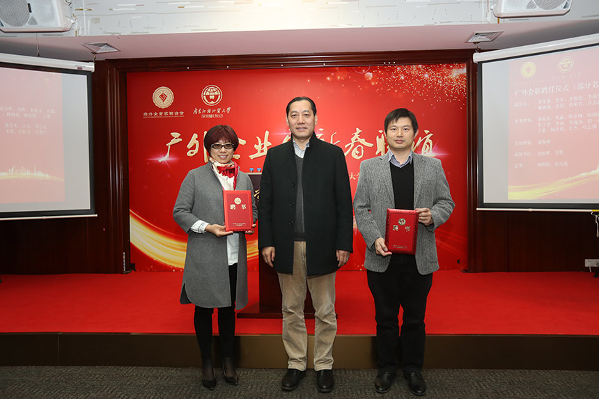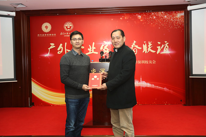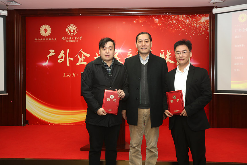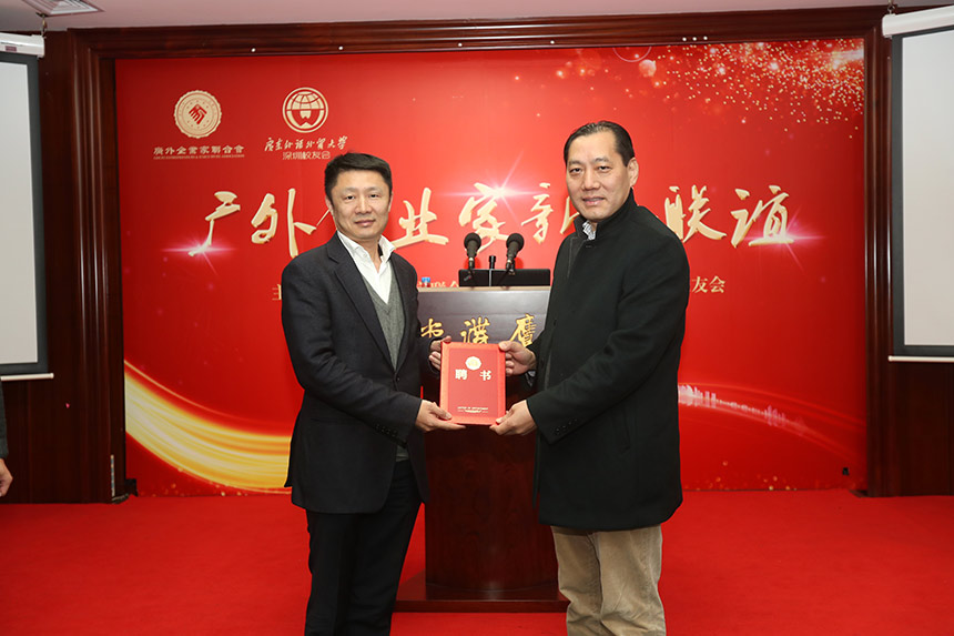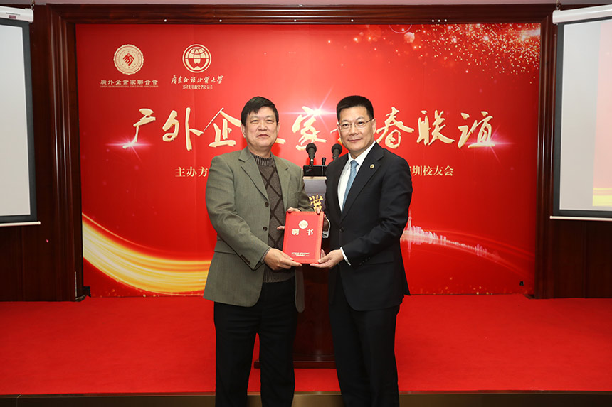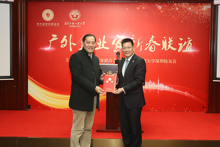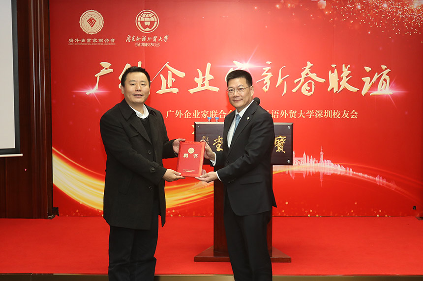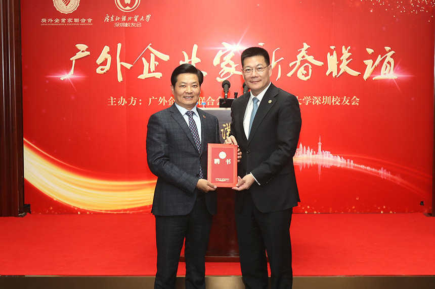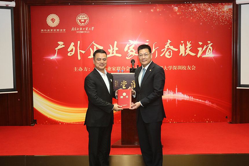 新春聯(lián)誼會(huì)上,廣東外語外貿(mào)大學(xué)企業(yè)家聯(lián)合會(huì)聘書頒發(fā)儀式拉開帷幕,廣東外語外貿(mào)大學(xué)企業(yè)家聯(lián)合會(huì)成立于2016年11月,旨在弘揚(yáng)明德尚行的廣外精神,為校友企業(yè)搭建全方位、高端、權(quán)威專業(yè)的服務(wù)平臺(tái),提供政策解讀,戰(zhàn)略定位,商務(wù)咨詢,宣傳報(bào)道,投融資咨詢,制度管理培訓(xùn)等創(chuàng)新性、務(wù)實(shí)性、多元化的服務(wù)與支持。建立共建、共享、共贏的合作模式,促進(jìn)企業(yè)發(fā)展和價(jià)值提升,共同為社會(huì)的建設(shè)和發(fā)展貢獻(xiàn)力量。