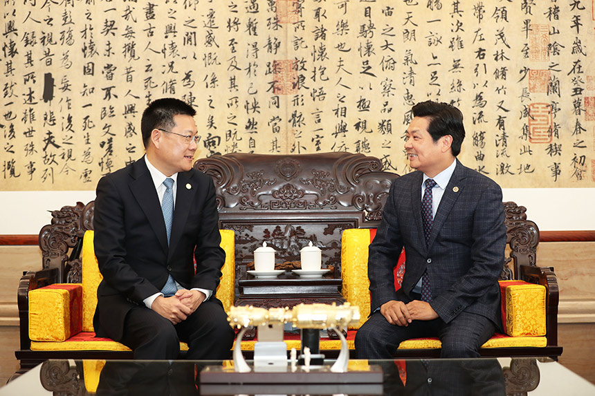 ▲寶鷹集團(tuán)董事局主席古少明與廣東外語外貿(mào)大學(xué)校長仲偉合深度交流