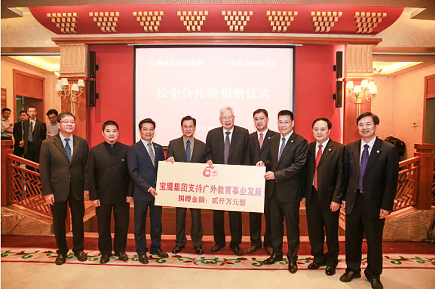 廣東外語外貿(mào)大學(xué)建校50周年之際,寶鷹集團(tuán)與廣外建立校企合作關(guān)系,雙方將在資源、 技術(shù)、 師資培養(yǎng)、 學(xué)生就業(yè)、科研活動(dòng)等方面精誠合作,最終實(shí)現(xiàn)校企雙贏的人才培養(yǎng)模式。期間寶鷹實(shí)業(yè)集團(tuán)向廣東外語外貿(mào)大學(xué)捐款人民幣2000萬元,用于發(fā)展廣東外語外貿(mào)大學(xué)的教育事業(yè)。