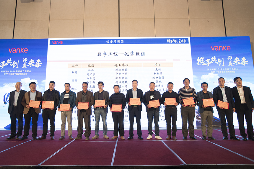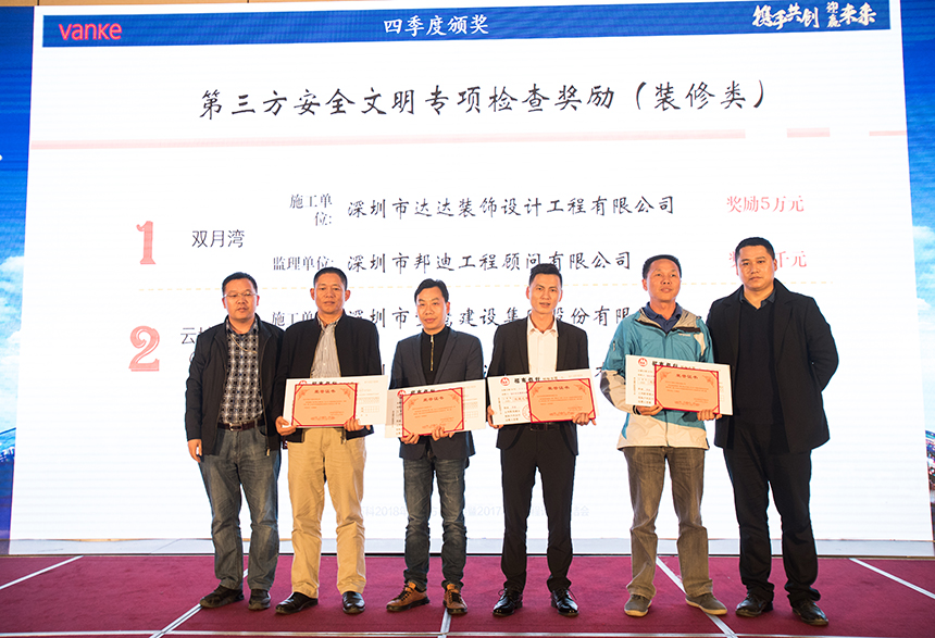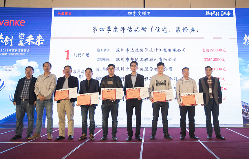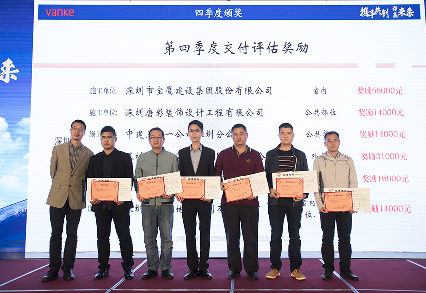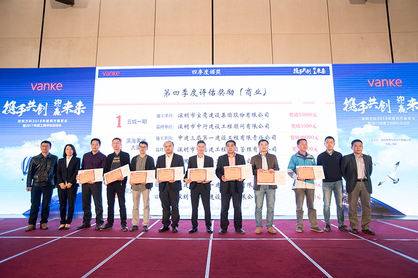 會(huì)上,萬科相關(guān)部門負(fù)責(zé)人分別從采購、工程、成本、售后等方面作了2017年度總結(jié)和2018年度規(guī)劃并公布了2017年度第四季度供應(yīng)商考核成績,寶鷹集團(tuán)憑借在工程管理、安全文明施工等方面的突出表現(xiàn)在多個(gè)項(xiàng)目中獲得第三方安全文明專項(xiàng)檢查(裝修類)、第四季度評(píng)估(商業(yè))、第四季度評(píng)估(住宅、裝修類)、第四季度交付評(píng)估、數(shù)字工程——優(yōu)秀班組等多項(xiàng)表彰及現(xiàn)金獎(jiǎng)勵(lì)。