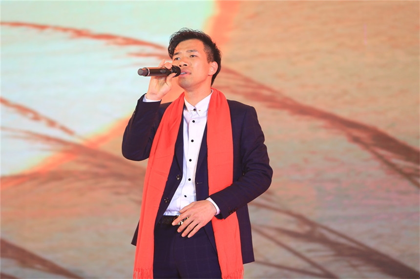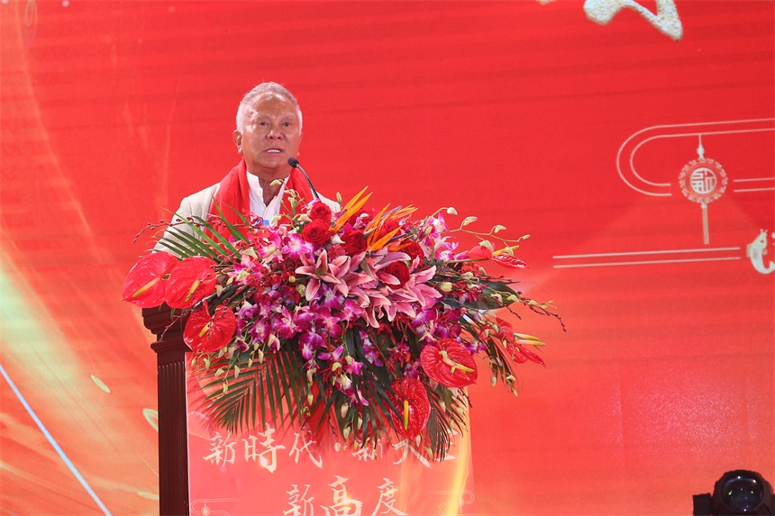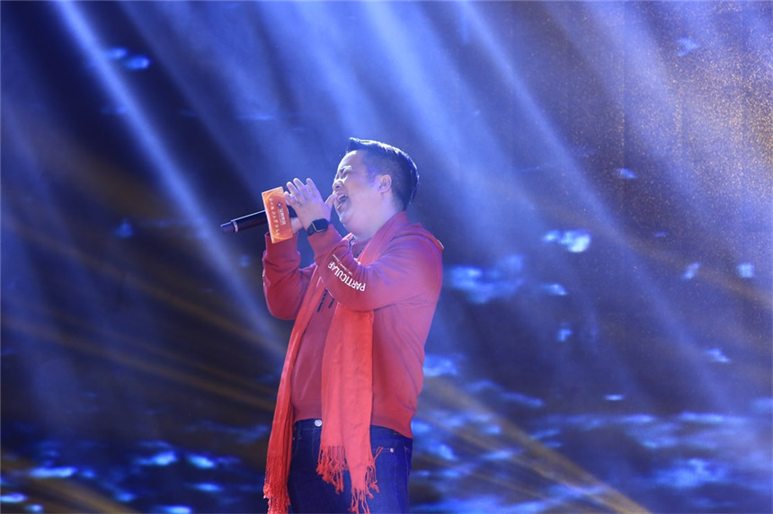 ▲寶鷹集團董事局主席古少明領唱《沒有共產(chǎn)黨就沒有新中國》
