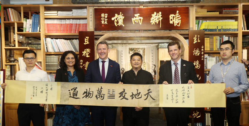 ▲寶鷹集團常務(wù)副總裁古樸贈與澳大利亞北領(lǐng)地洲政府省長邁克爾· 剛納(Hon Michael Gunner MLA)寶鷹美術(shù)館館長王躍慶書法作品“天地交 萬物通”