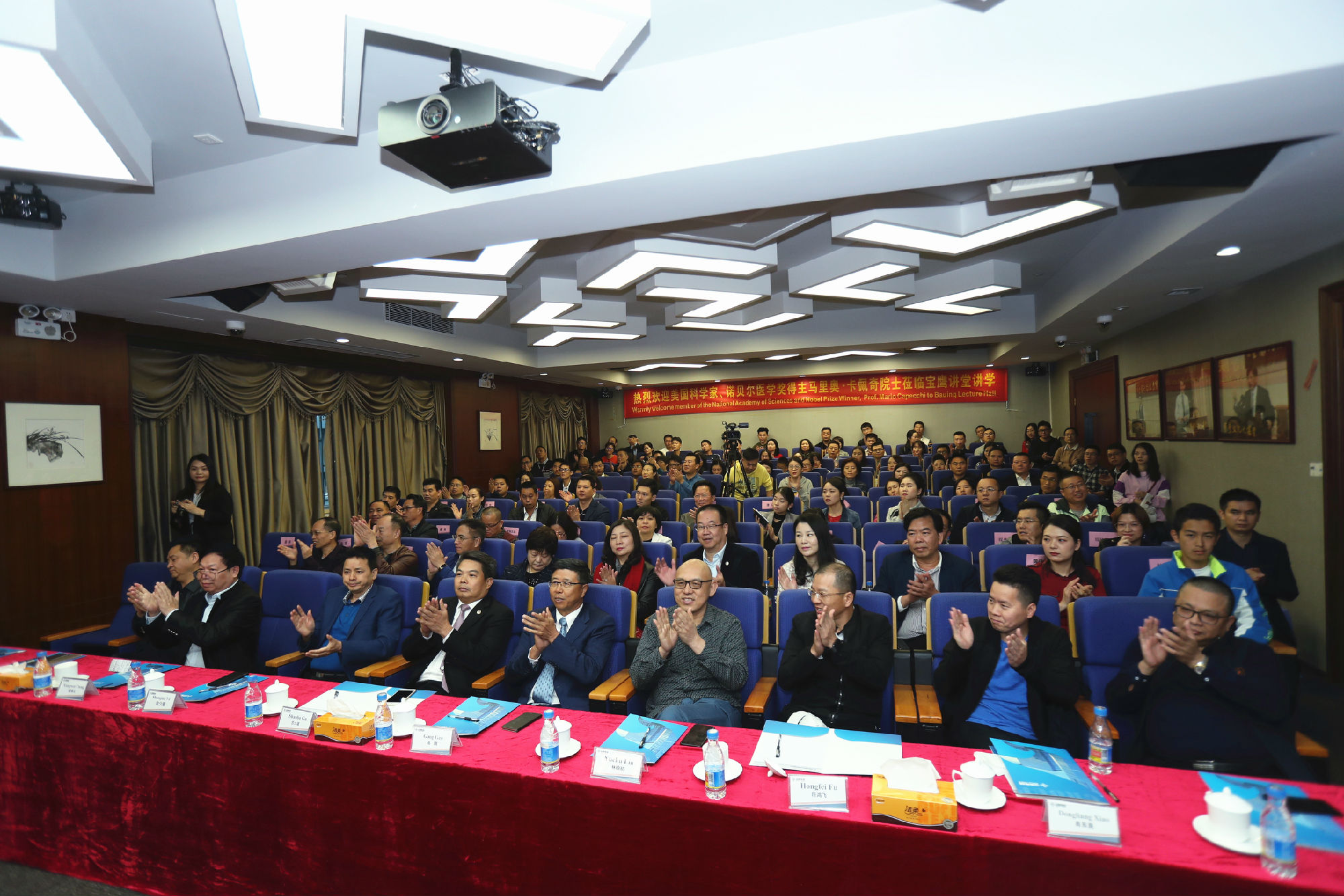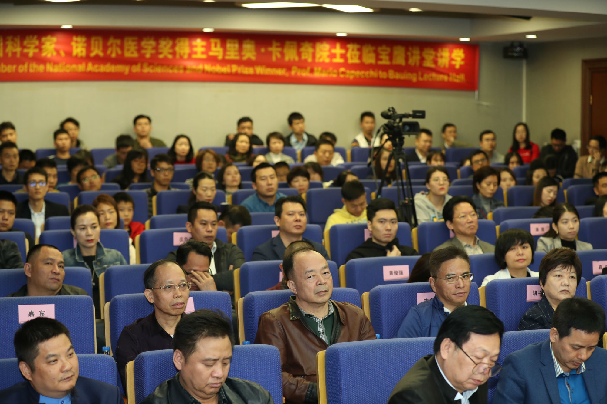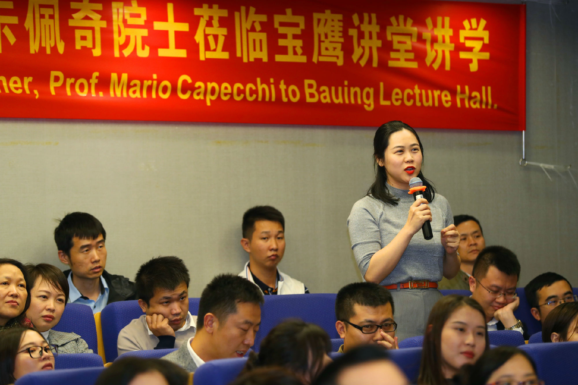 馬里奧·卡佩奇院士博士生、中國農(nóng)業(yè)大學吳森教授隨行并實時傳譯??ㄅ迤嬖菏康木史窒硪鹆嗽谧襟w及聽眾的熱烈探討。