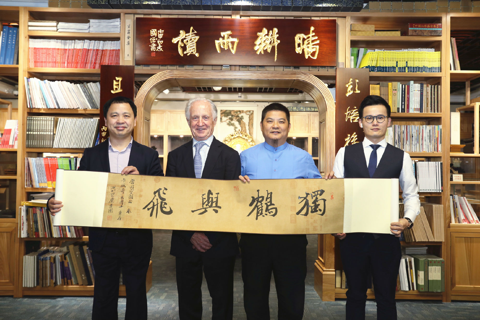 ▲寶鷹集團副總裁古樸向卡佩奇院士贈送西泠印社社員、寶鷹美術館館長王躍慶書法作品《獨鶴與飛》