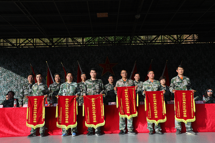 ▲深圳裝飾協(xié)會會長高剛,寶鷹集團董事局主席古少明,寶鷹股份董事長古少波為“安全文明施工示范項目部”頒獎