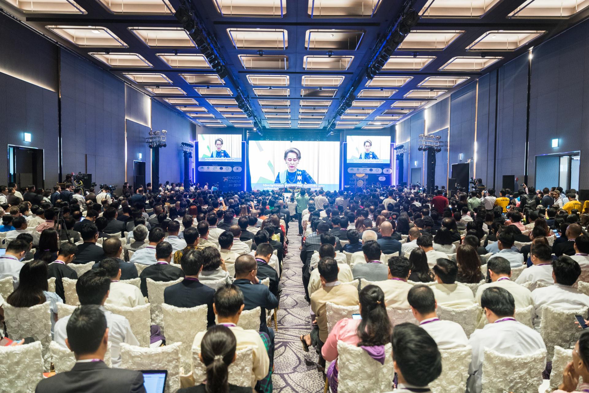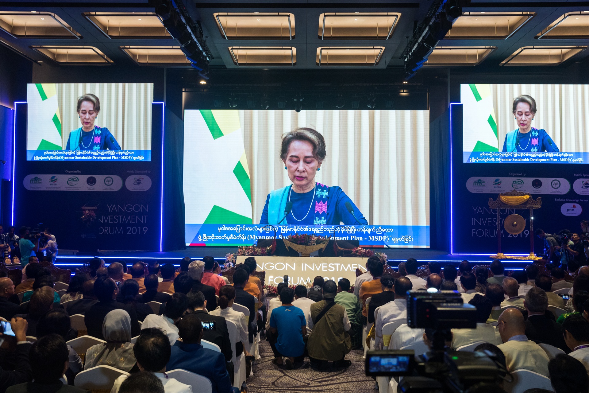 國務資政昂山素季為論壇發(fā)表視頻致辭。緬甸投資和對外經(jīng)濟關系部聯(lián)邦部長兼緬甸投資委員會主席吳當吞(U Thaung Tun)宣布論壇開幕。