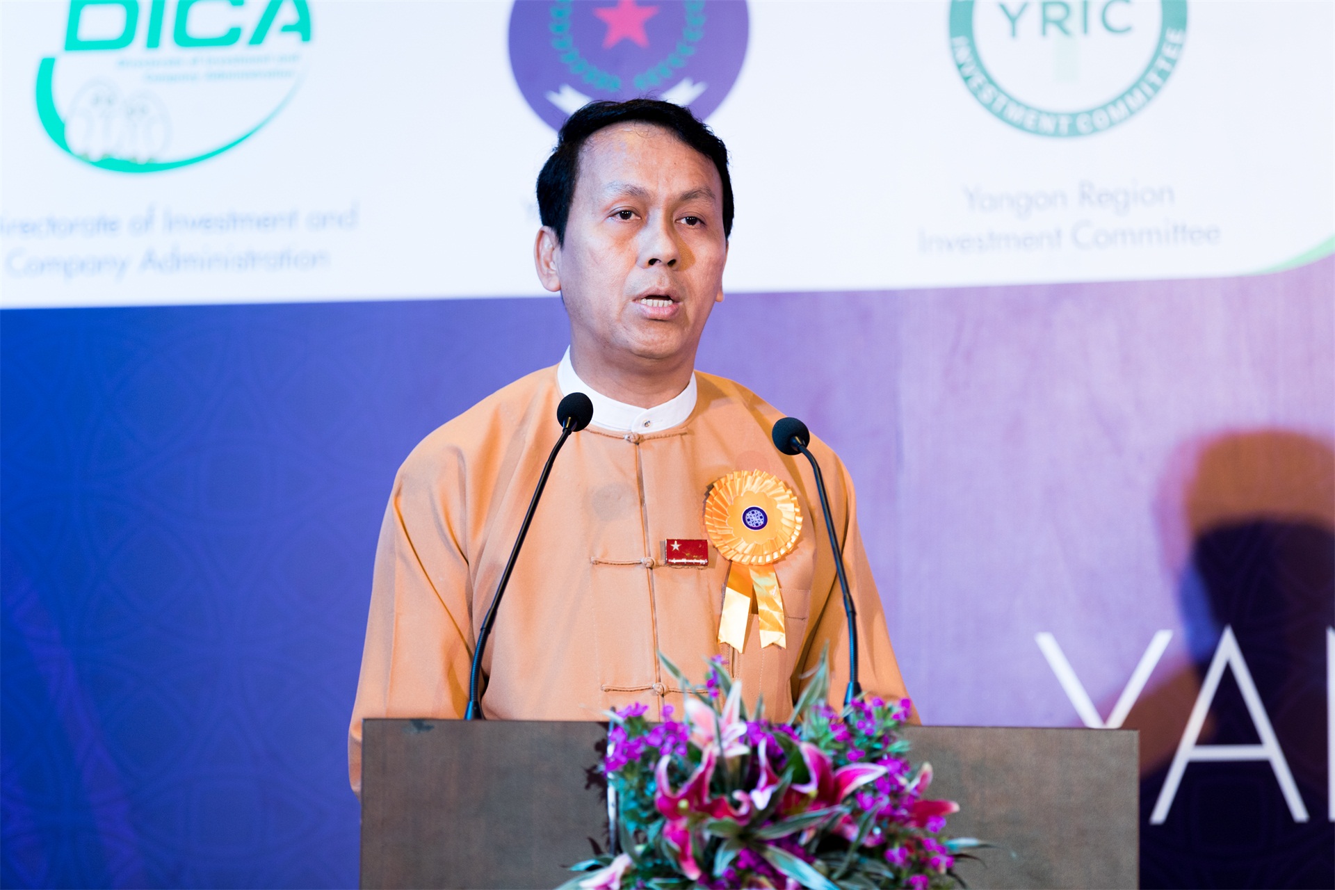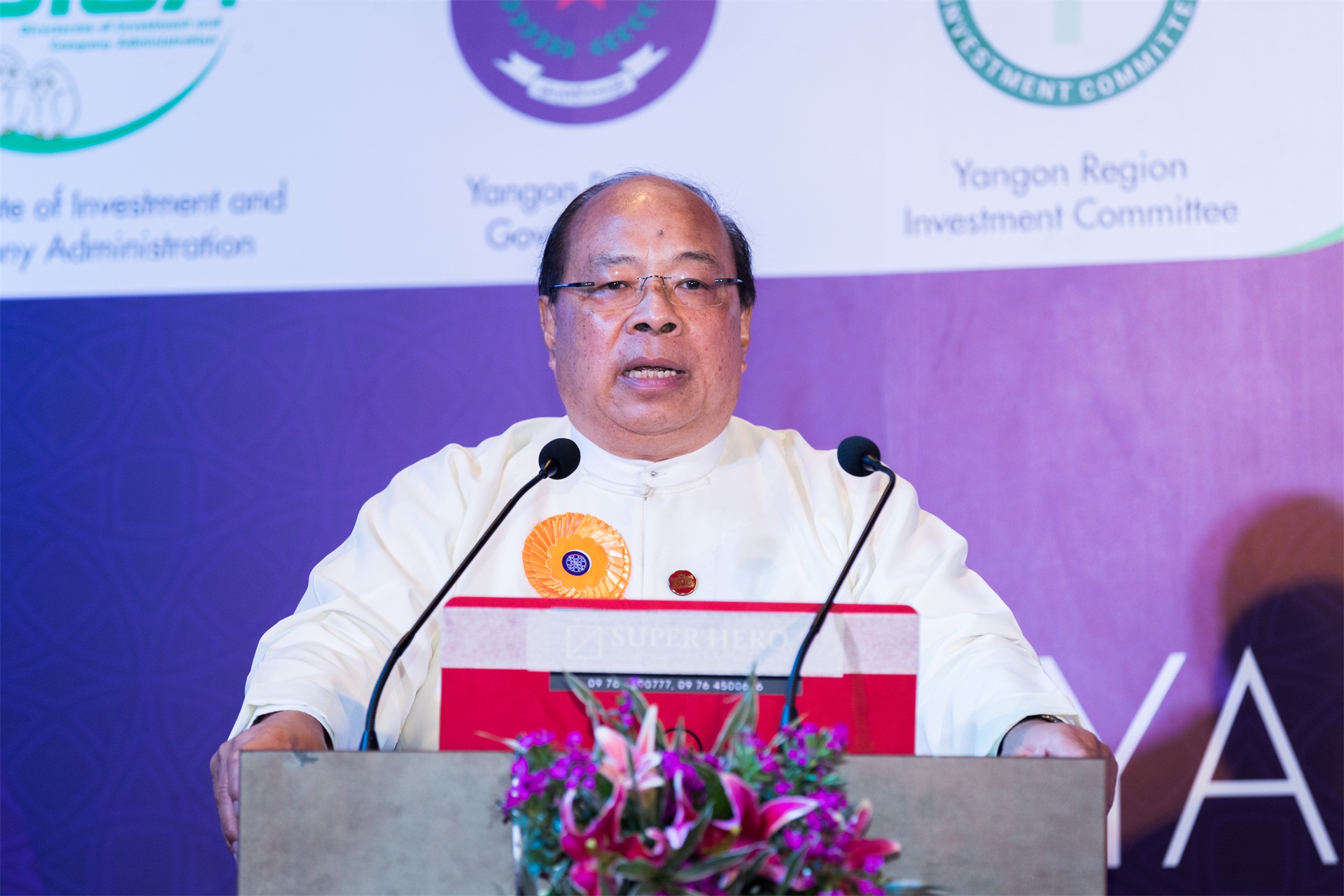 ▲ 緬甸仰光省政府省長吳漂敏登(U Phyo Min Thein)致辭并表示希望把仰光省打造成世界上最吸引外資來投資的中心地帶