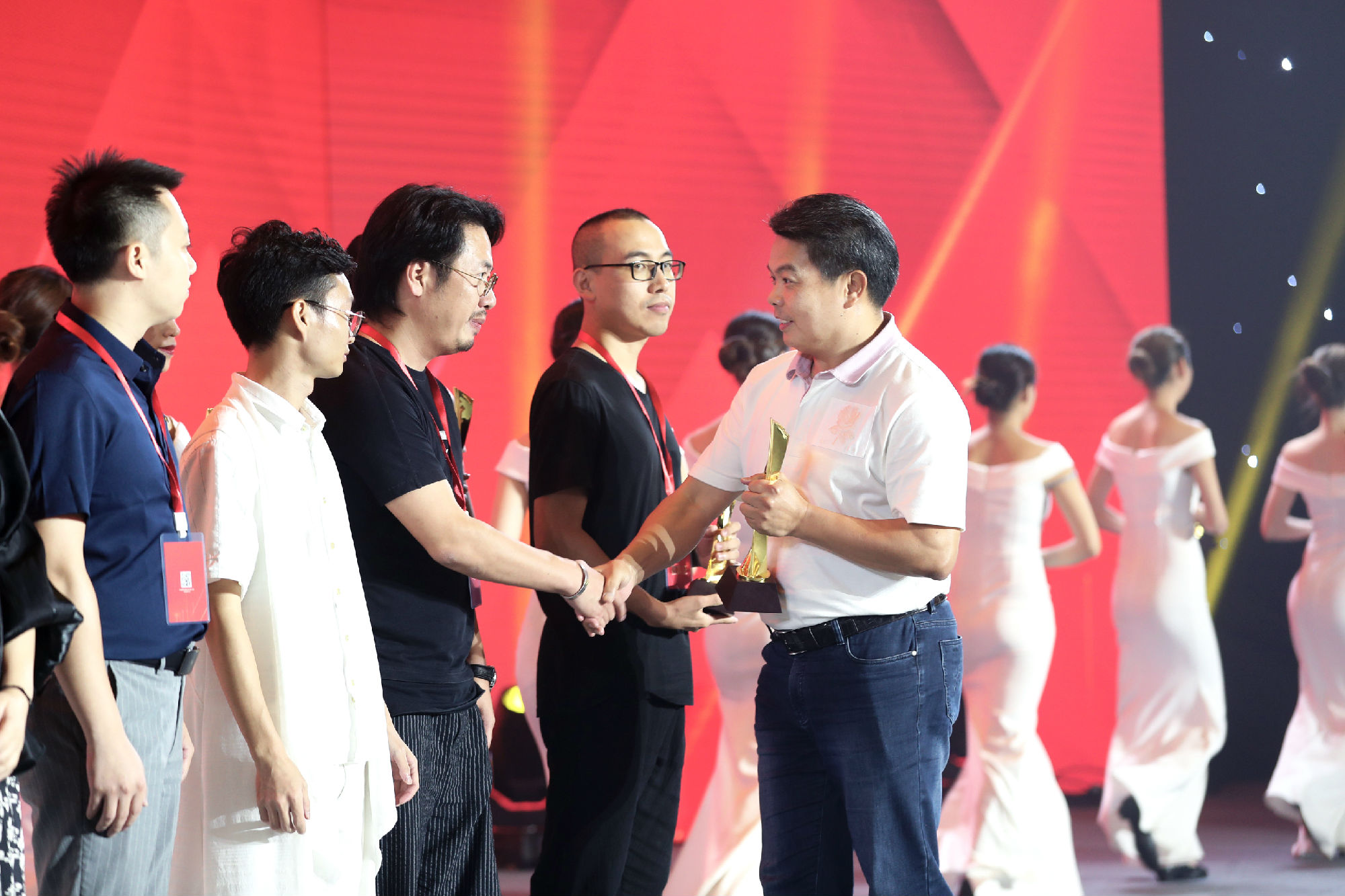 ▲中國建筑裝飾協(xié)會副會長、寶鷹集團(tuán)董事長古少波為獲獎?wù)哳C獎