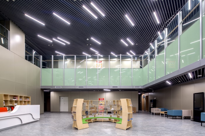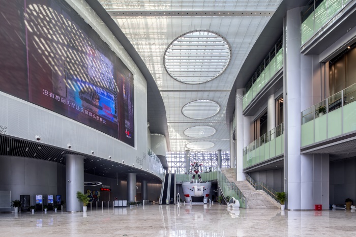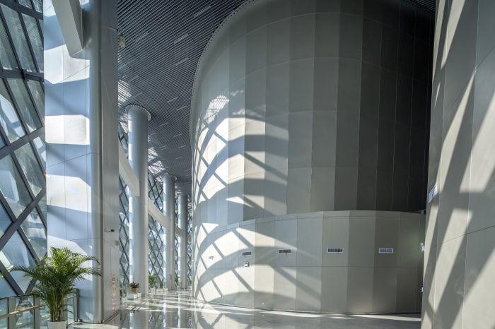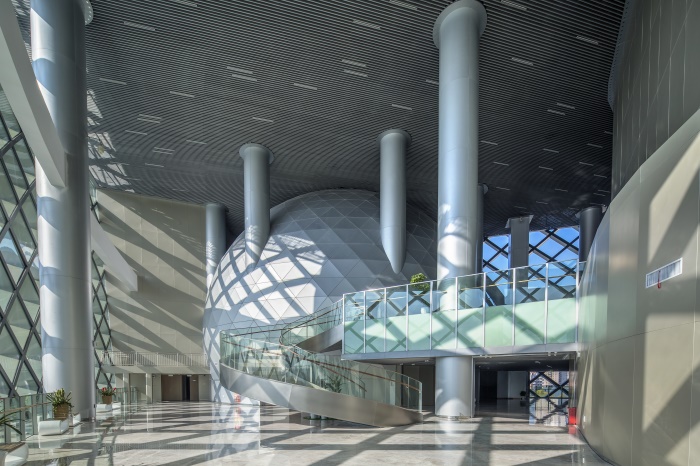 科技館大廳及公共區(qū)域內(nèi)運用了大量的夾層設(shè)計,配以超高鋁板立柱和大面積的銀色鋁板幕墻,使空間顯得高大寬敞、開放通透,未來感和科技感十足。