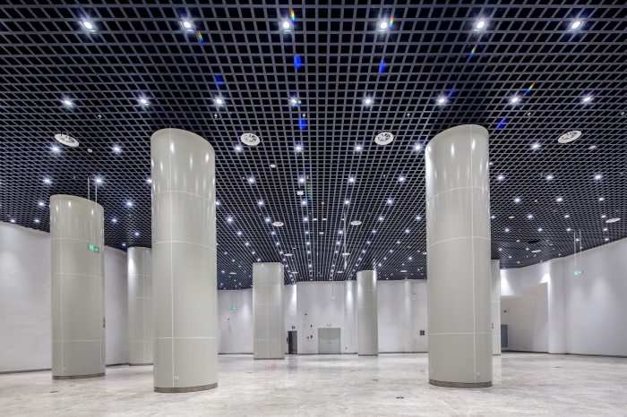 林立在各處的立柱,最高的有21.75m,直徑達1.6m。立柱與鋁板的垂直高度、拼接縫橫豎對齊,使場館整體高端大氣,科技感十足。
