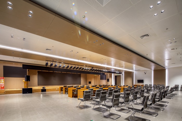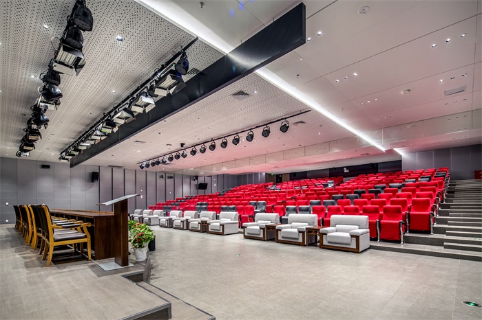 科普報告廳和科普劇場采用科技、簡約的裝飾風格,注重其使用性。鋁板墻面、吊頂與場館的整體風格相一致,整齊統(tǒng)一。場館是舉辦“科普大講堂”和“科普互動劇”表演的主要場所。