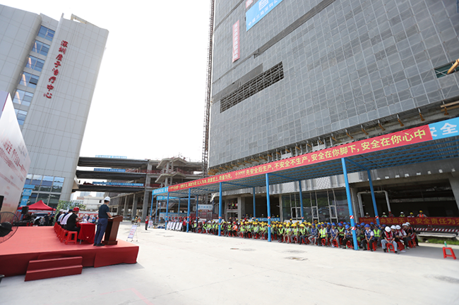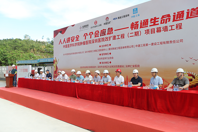 深圳市建筑工務(wù)署工程管理中心副主任符翔、項目工程師殷積彪,深圳市裝飾行業(yè)協(xié)會常務(wù)副會長、總工程師王彥波、培訓(xùn)中心主任莫晉里,深圳市龍崗區(qū)龍城街道辦副主任程俊雄、副主任雷煥雄,深圳市龍崗區(qū)大運城消防救援站副站長何明,重慶賽迪工程咨詢有限公司大灣區(qū)分公司總經(jīng)理付光平,中建三局集團(深圳)有限公司一公司安全總監(jiān)劉振曉,深圳仁安醫(yī)院常務(wù)副院長吳云劍,深圳市寶鷹建設(shè)集團股份有限公司董事長肖家河、副總裁鐘志剛、安全管理部總監(jiān)陳龍、幕墻事業(yè)部總經(jīng)理韓偉杰、公司技術(shù)負責人葉石堅等相關(guān)領(lǐng)導(dǎo)以及中國醫(yī)學科學院腫瘤醫(yī)院深圳醫(yī)院改擴建工程(二期)幕墻項目建設(shè)者參加活動。