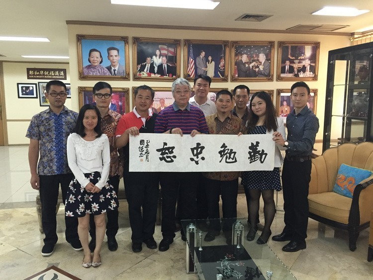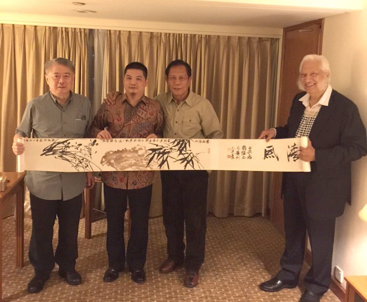 6月22日,周國(guó)城主席在古樸副總裁和印尼寶鷹工作人員的見(jiàn)證下,為印尼寶鷹題字,一起祝福印尼寶鷹事業(yè)飛黃騰達(dá)。6月23日,印尼INTILAND地產(chǎn)集團(tuán)董事長(zhǎng)吳端華設(shè)宴接待了周國(guó)城主席和古樸副總裁一行,暢敘了與寶鷹的合作情誼。周國(guó)城主席在宴席上向吳端華董事長(zhǎng)贈(zèng)送了自己的手卷作品。之后,周國(guó)城主席和古樸副總裁在熊德龍董事長(zhǎng)和吳端華董事長(zhǎng)的陪同下,拜訪了印尼國(guó)家安全部部長(zhǎng)Stiyoso,并贈(zèng)送了周國(guó)城主席的手卷作品。