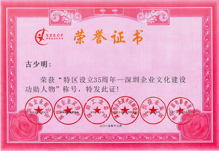 ▲古少明主席獲評(píng)特區(qū)設(shè)立35周年-深圳企業(yè)文化建設(shè)功勛人物獎(jiǎng)