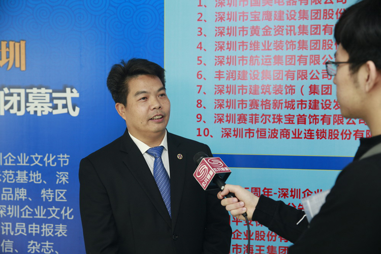 ▲古少波在頒獎(jiǎng)現(xiàn)場(chǎng)接受深圳電視臺(tái)采訪,介紹寶鷹集團(tuán)企業(yè)文化建設(shè)經(jīng)驗(yàn)