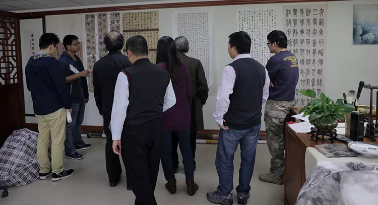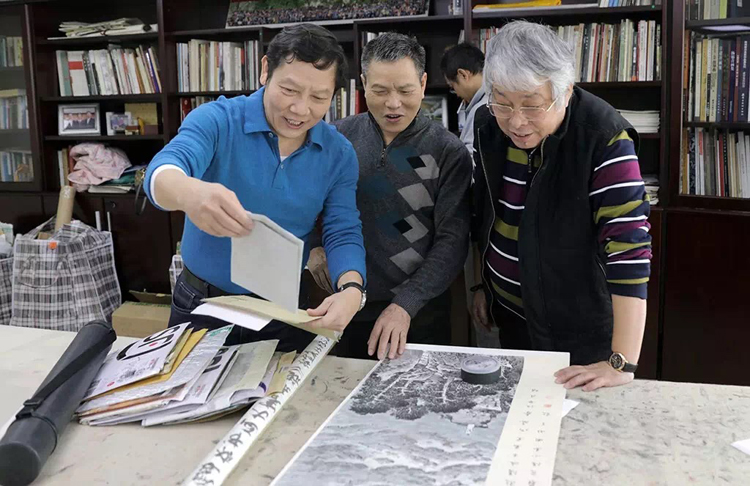 ▲各位評(píng)委探討參賽畫作