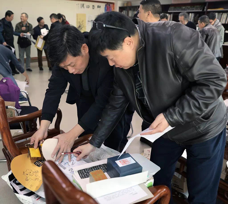 ▲評(píng)委老師評(píng)比參賽印章作品