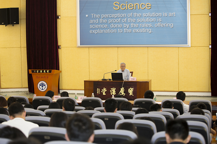 隨后,王兆凱院士開(kāi)講《數(shù)學(xué)、科學(xué)、工程與工業(yè)創(chuàng)新》。講座中,王兆凱院士先通過(guò)對(duì)數(shù)學(xué)、科學(xué)、工程與工業(yè)的精確定義,并闡述各個(gè)學(xué)科之間關(guān)聯(lián),帶領(lǐng)大家回顧社會(huì)發(fā)展過(guò)程中各學(xué)科的相互推進(jìn),指出了部分學(xué)生在求知過(guò)程中的誤解。王兆凱院士認(rèn)為:數(shù)學(xué)是可證的,并可用多種方式來(lái)進(jìn)行求證;科學(xué)是客觀存在的,無(wú)需驗(yàn)證但一直在改進(jìn),數(shù)學(xué)在社會(huì)發(fā)展到一定階段后才與科學(xué)產(chǎn)生了聯(lián)系;科學(xué)用于人工便是工程,工程匯聚形成工業(yè)。